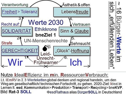 Bild Rat-3-SOLL spiegelt die Ethik im kontinuierlichen Verbesserungsprozess der Firma & Institution (EU, Staat, Konzern, ...). Der Glaube an positive Wirkung der 20 +/-Rathaus-Werte-TrendElemente (20RWT lt. Bild Rat-2) ist die Hoffnung.